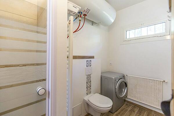 La salle d’eau avec WC est équipée d'une douche, d'un lave linge et sèche linge. Casier à skis dans la résidence.