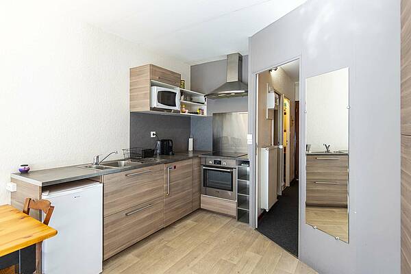 Le balcon à une exposition EST, il offre une vue sur le domaine skiable, les montagnes et l'esplanade du Valentin. Séjour équipé d'un canapé convertible, grande TV écran plat, console de jeux WII, coin repas et kitchenette avec frigo top, four, 3 plaques inductions, micro ondes, cafetière Nespresso, grille pain ainsi qu'un grand placard de rangement.