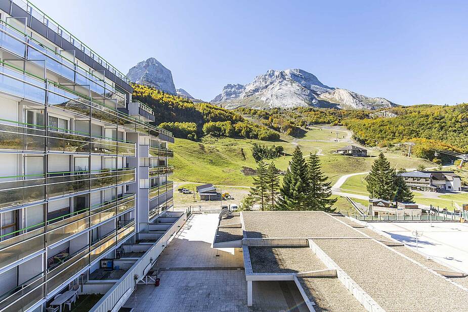 Le séjour lumineux avec télévision et canapé, lit rabattable pour 2 personnes, donne sur un balcon offrant une belle vue sur le domaine skiable.