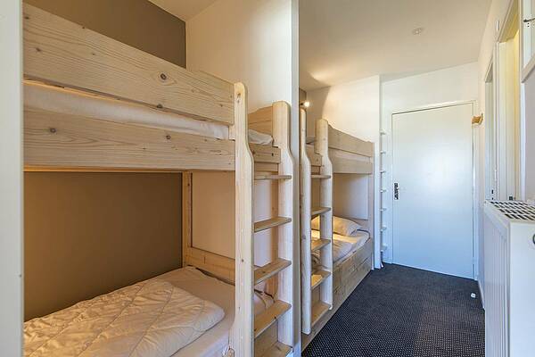 A l'entrée il y a 2 lits superposés (4 couchages) une place, la salle d'eau avec douche, lavabo, meuble sous vasque, sèche cheveux. WC séparés.