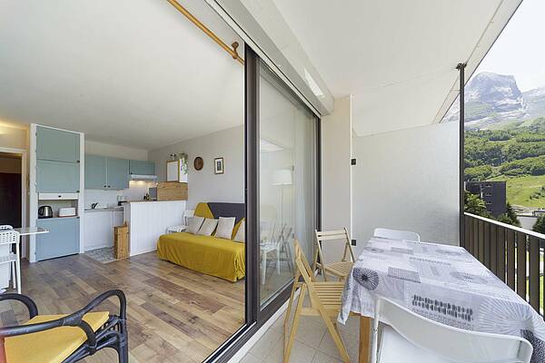 Balcon accessible depuis le séjour, aménagé d'une table et des chaises. Profitez de cet espace extérieur pour prendre un café le matin ou un apéritif en soirée, tout en admirant la vue.