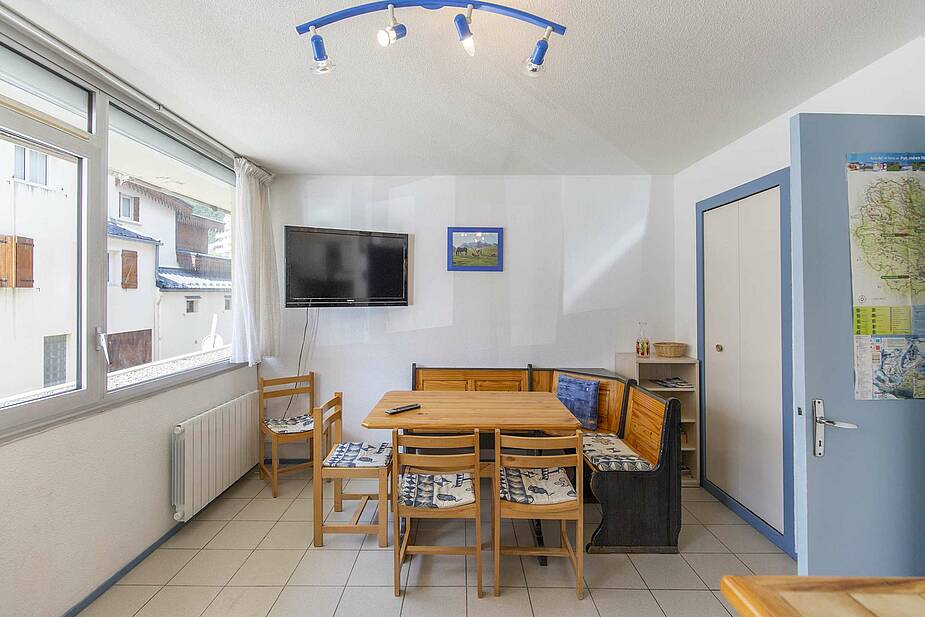 Le séjour avec de grandes fenêtres, exposé Ouest est équipé d’un canapé convertible Clic-Clac puis d’une télévision écran plat.