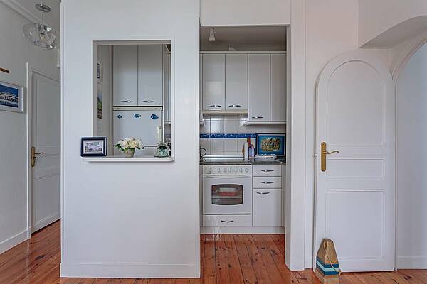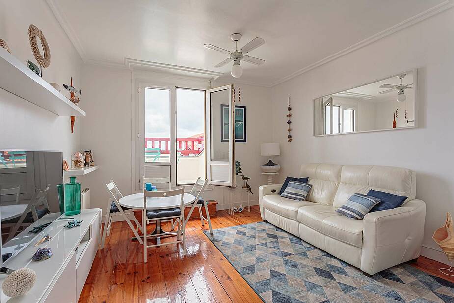 Cet appartement à la décoration soignée se compose d'un salon donnant accès à un balcon ( attention à la petite marche pour y accéder) avec vue sur la mer et la grande plage d'Hendaye et d'une cuisine semi-ouverte parfaitement équipée.